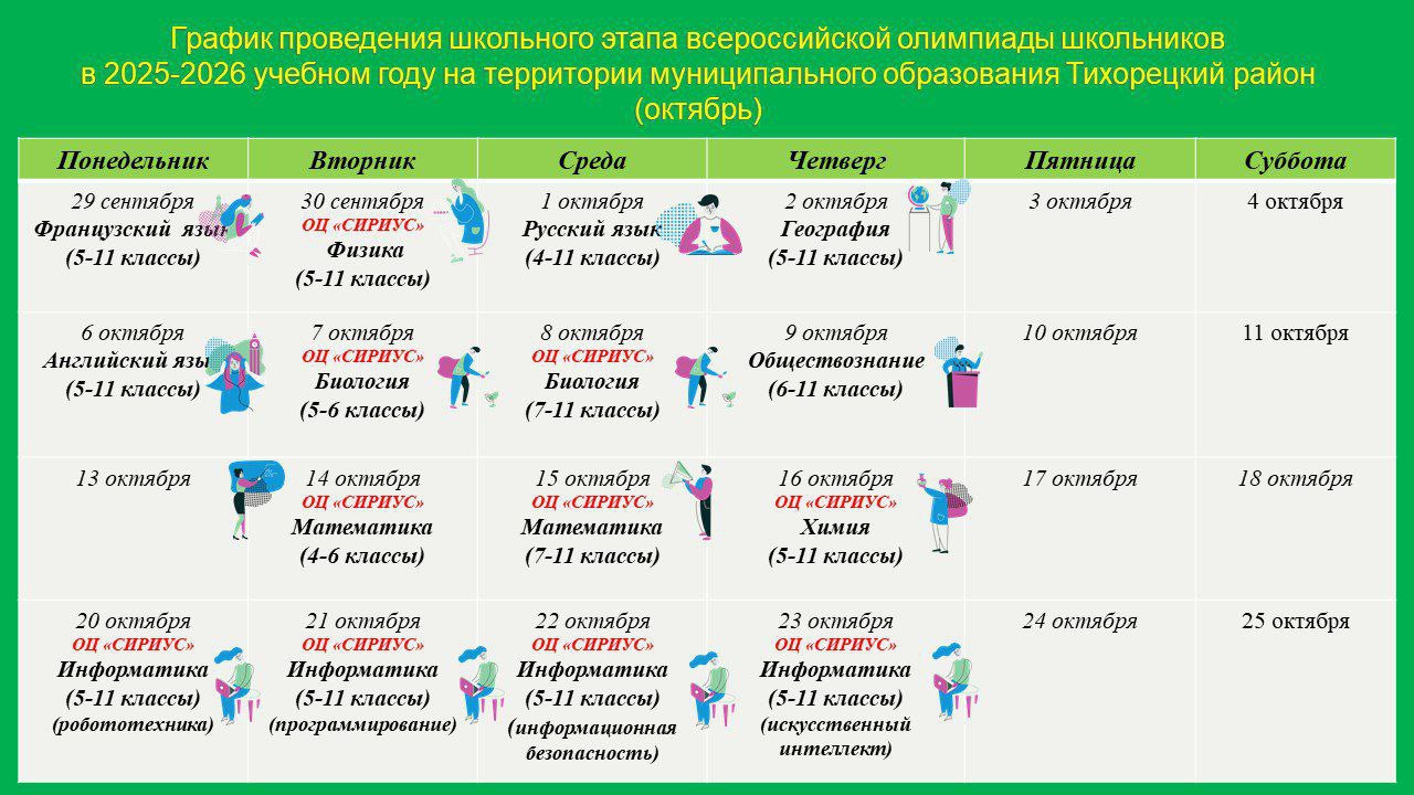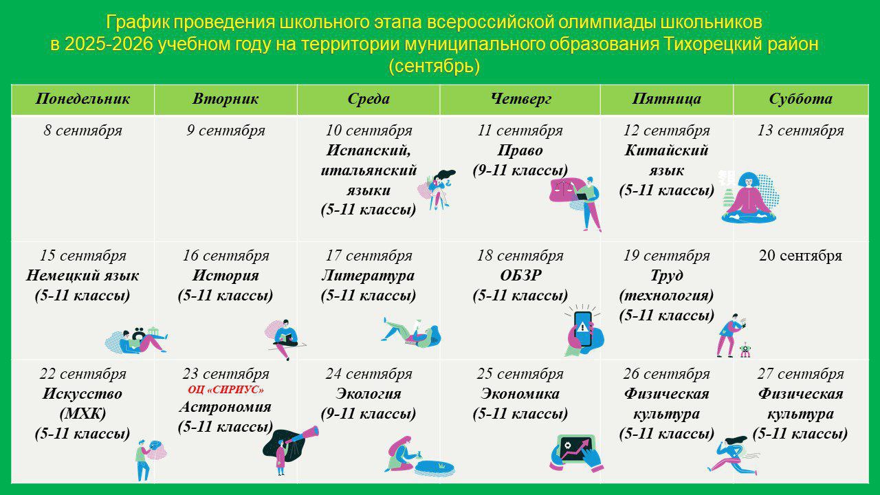 В Тихорецком районе школьный этап олимпиады пройдет с 10 сентября по 23 октября 2025 года.